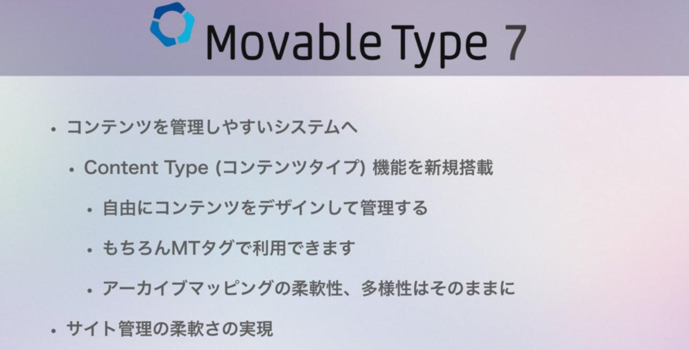 MT6とMT7の違いはこの通り、今まではWebサイト、ブログ、エントリーというもので構成されていたブログタイプが、完全にWebサイト、コンテンツという独立したものになります。MTユーザーとしては、全く別物になるという印象です。ちなみにページやエントリーは今後なくなり、コンテンツタイプに統一されるそうです。