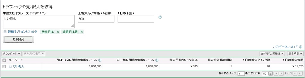 というわけで、さっそく検索ワードに対するクリック単価と一日の推定費用を見てみましょう。