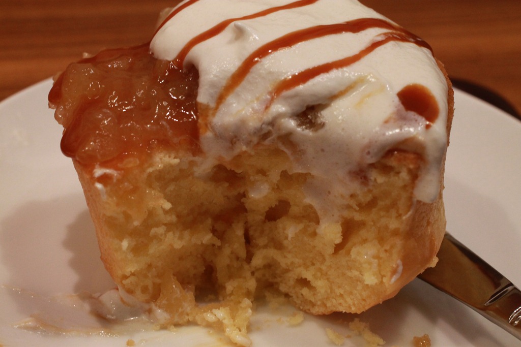 ホットケーキの面、半分くらいに泡立てた生クリームとキャラメルがかかっていて、もう半面にはアップルジャムがかけられていました。
